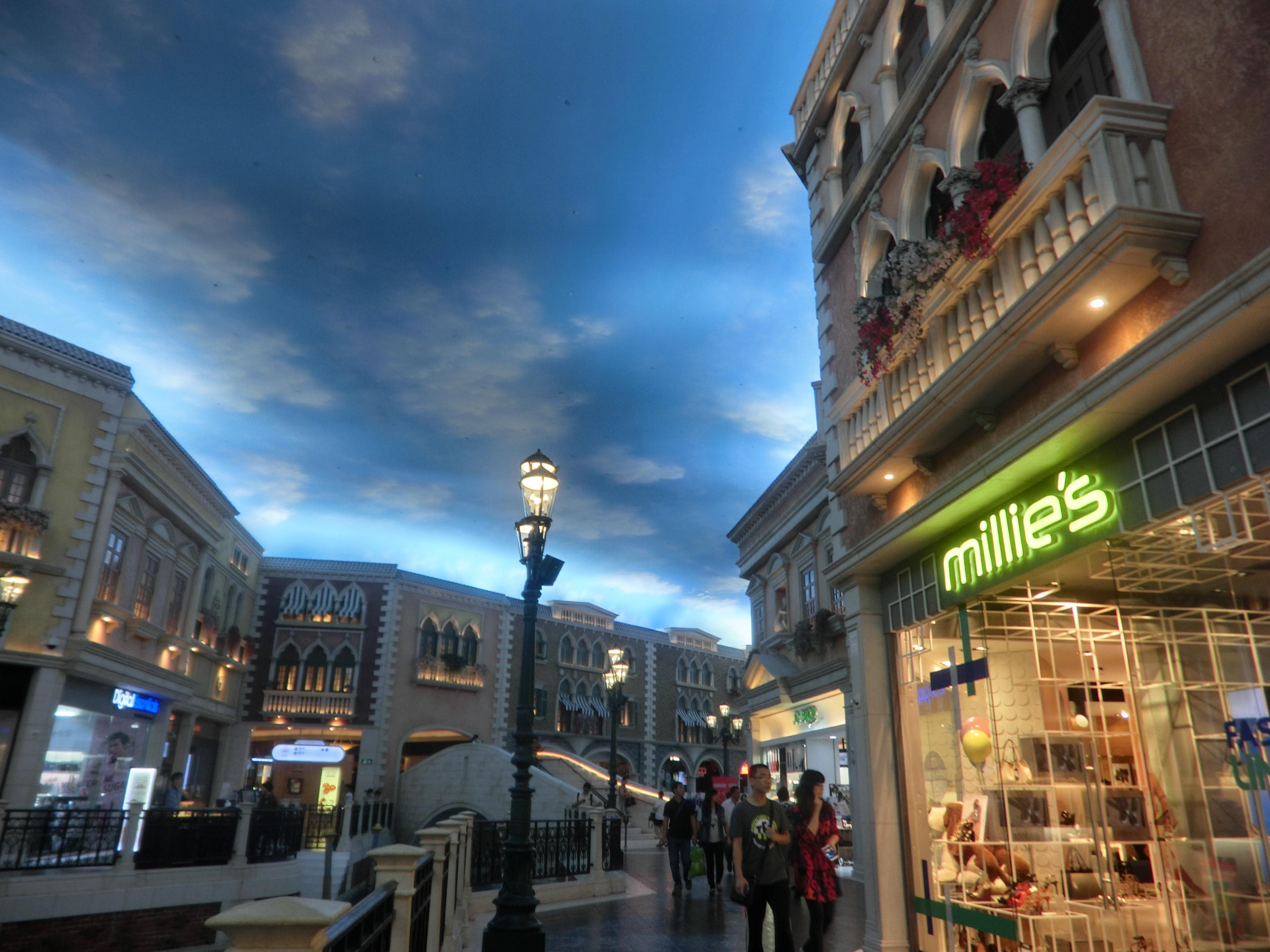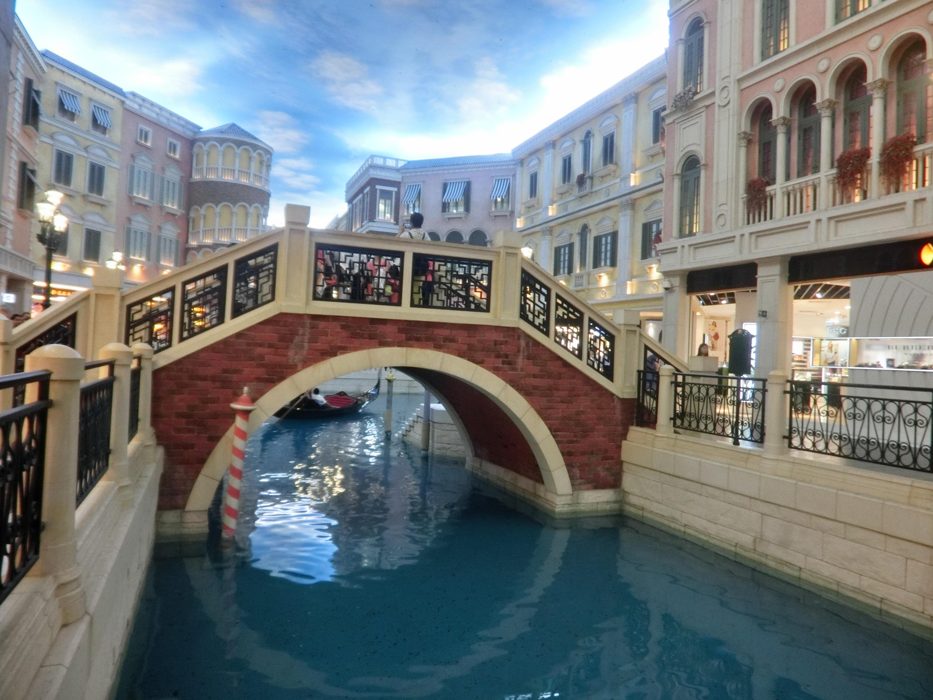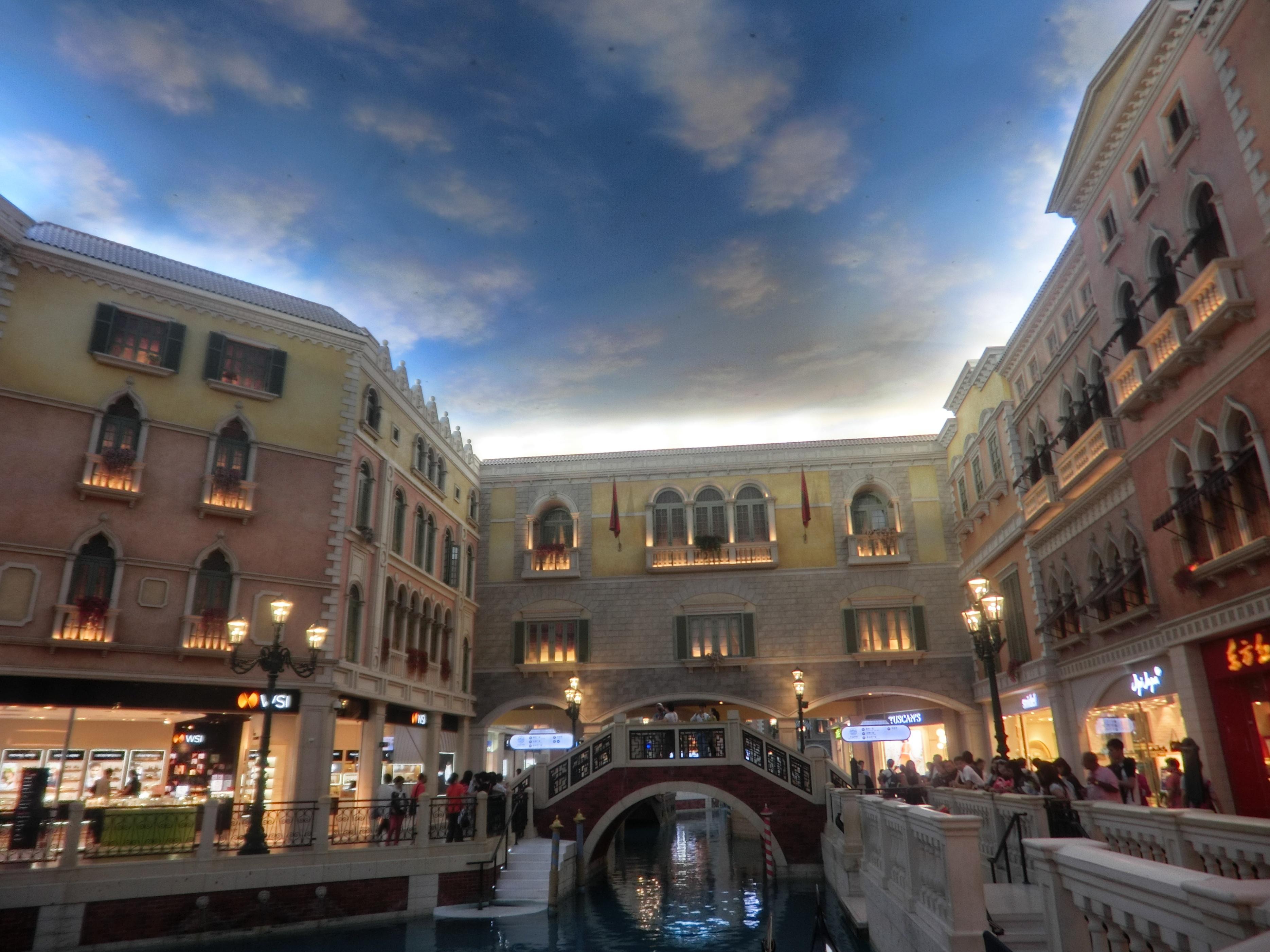 拍照还没拍过瘾导游就开始催促我们去下一站了——威尼斯人,是集会展、酒店及表演、购物元素于一体的酒店,算是澳门必打卡景点;以威尼斯水乡为主题,酒店二楼是个购物广场,有充满威尼斯特色拱桥、小运河及石板路,还有那逼真的仿天空天花板,都无不让人惊叹。