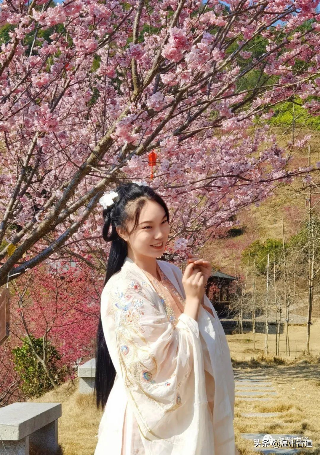 很多小哥哥小姐姐身着汉服行走在在樱花园里,随行伙伴用镜头记录下浪漫时刻。无论何种装扮,樱花园带给你的都是对美好的向往和满足。偶遇来自乐清的旅拍爱好者“桃夭”,她和友人正在进行摄影创作,留下惊艳时光的瞬间。